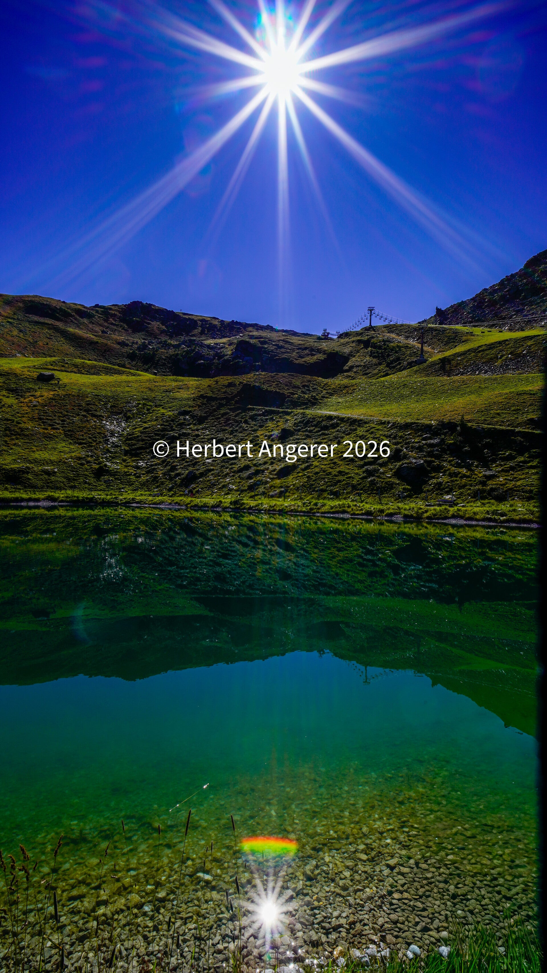 31.08.2025 10:53 - Sonnenstern über dem Schartenkogel am Glungezer/TIROL, Spiegelung im Zirbensee incl. kleinem Stern und Regenbogen im See. Für mich ein ganz besonderes Foto.🌞📸🍀